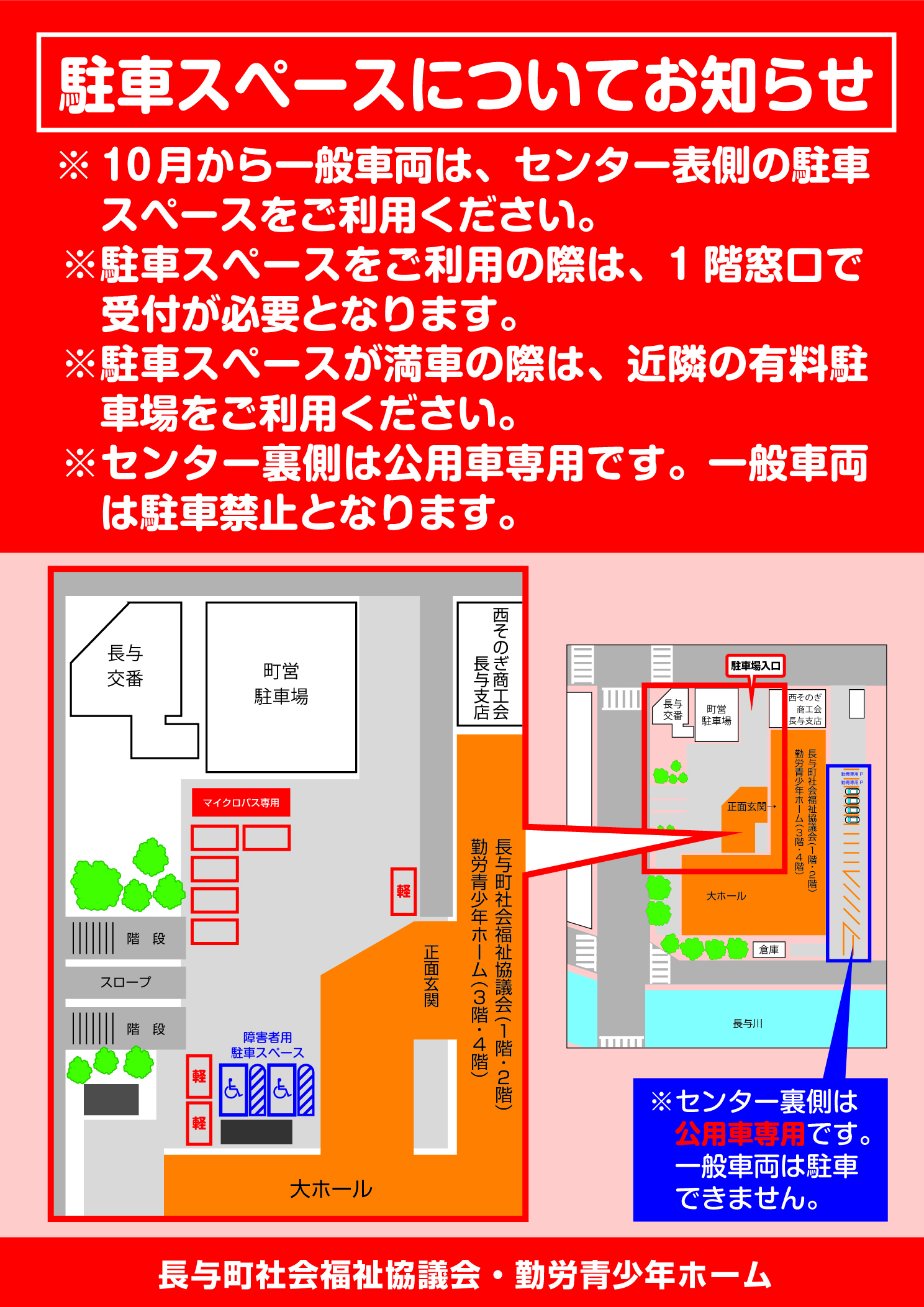 10月1日(水)からセンター表側に一般車両の駐車スペースが変更になりました。ご利用には、センター1階窓口で受付が必要となります。皆さまのご協力をお願いします。詳細は下記をご確認ください。↓↓↓詳細はこちらをクリック↓↓↓